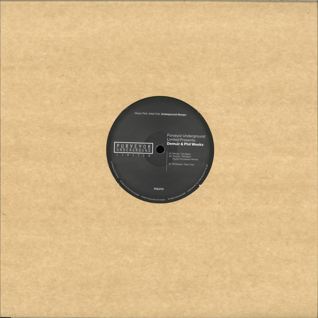 While Toronto producer Demuir regularly features on a wide variety of house labels, it's always worth keeping an eye on his Purveyor Underground label and its' limited-edition offshoot. He's back on the latter label for this outing, where he shares vinyl space with long-serving Parisian producer (and Robsoul founder) Phil Weeks. Demuir handles side A, delivering two passes on 'The Spark': the lightly funk-fuelled original mix, where woozy jazz samples dance atop a rubbery bassline and vintage Masters at Work style beats, and the more bumpin', cut-up and sub-heavy swing of the 'Some Too Suspect remix'. On side B, Weeks delivers 'Party Time', a typically low-slung and analogue-rich deep house number where classic boogie-era vocal samples and occasional chords wrap around loose-limbed machine drums and a killer TB-303 acid bassline.