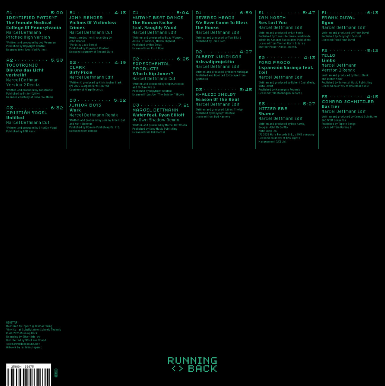A DJ, producer and significant figure in contemporary electronic music, Marcel Dettmann steps forward to contribute to Running Back’s ongoing Mastermix series. Whereas previous editions of Mastermix have taken an ear to the sound of lapsed, legendary clubs such as Wild Pitch and Front, Dettmann’s curation deftly captures the man himself in ongoing perpetual motion, raiding the vault for his own precision-tooled edits, long-employed on dancefloors to devastating effect. Alongside a continuous mix, this release arrives as a 3LP gatefold, and as a limited edition cassette.