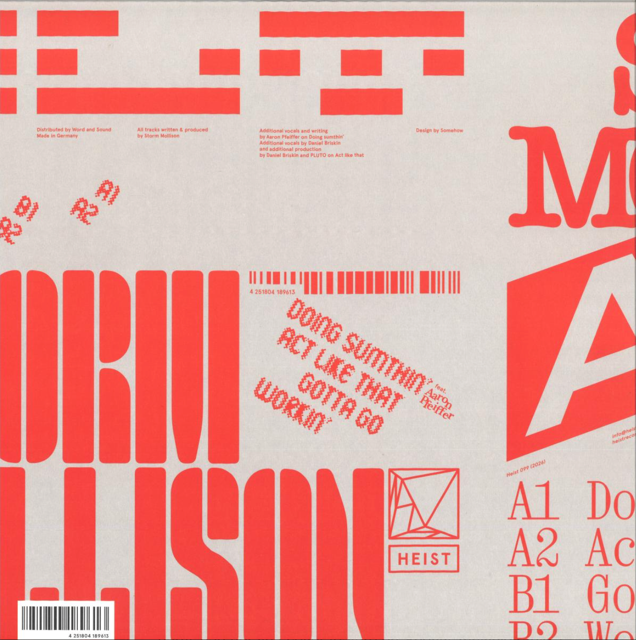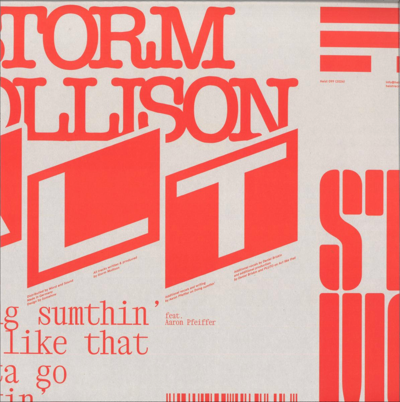 Stom Mollison continues to make a big impression. She's already released a string of admired solo EPs on Hot Haus, Forever Records and W&O Street Tracks, and last year scored a colossal international club hit alongside Dutch producer Ki/Ki ('Get Ready For The Party'). Here she makes her bow on Heist via an EP that showcases her songwriting and singing skills as much as her production chops. 'Act Like That' and 'Workin' are both deep, soulful and propulsive house jams peppered with attractive references to 21st century r&b, while 'Gotta Go' is a bouncy, chunky and piano-rich affair that sits somewhere between Cinthie and Peggy Gou. Best of all though is 'Doin' Something', a peak-time ready, organ-rich roller topped off by raps and spoken word vocals from Aaron Pfeiffer.